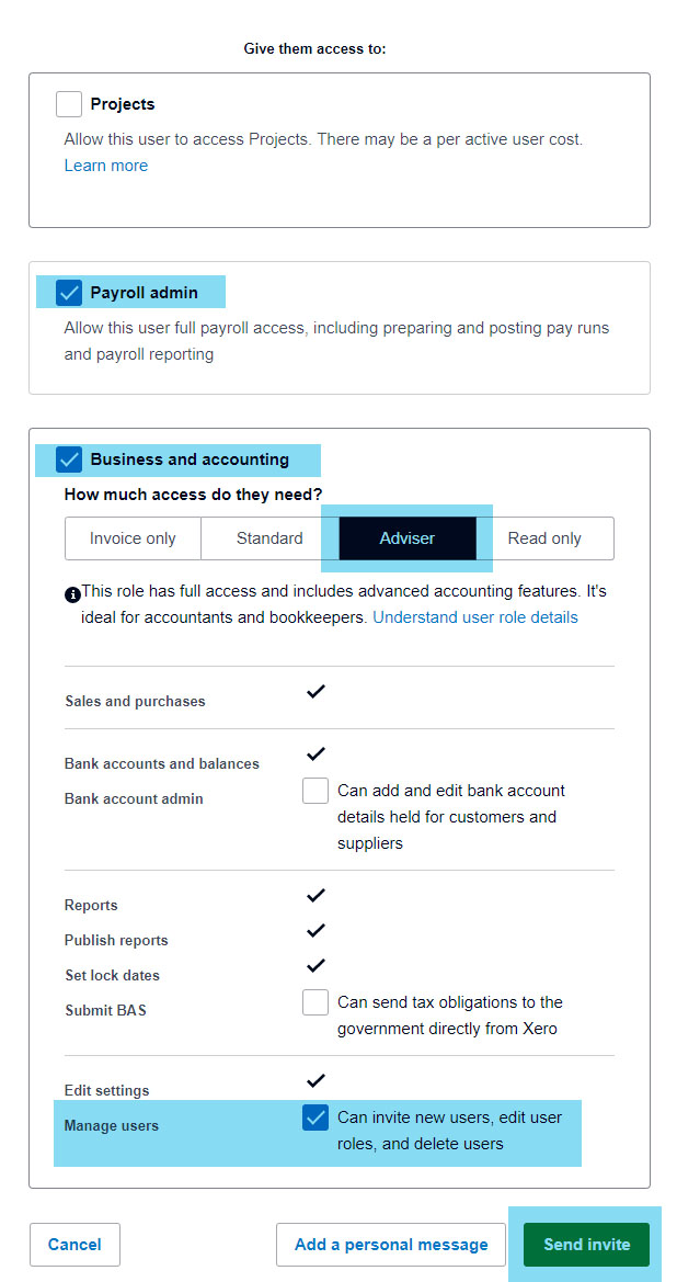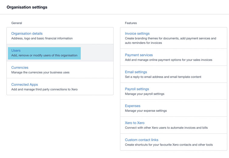 To invite us into your Xero file, go to Settings > Users > Invite A User. Please invite Kate O’Mara (kate@bizangels.com.au) as a Business Advisor with Payroll Admin access.