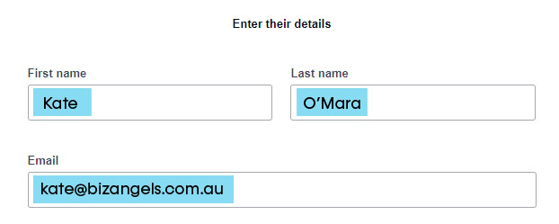 Step 5: Enter Kate O’Mara for the name and kate@bizangels.com.au as the email address.